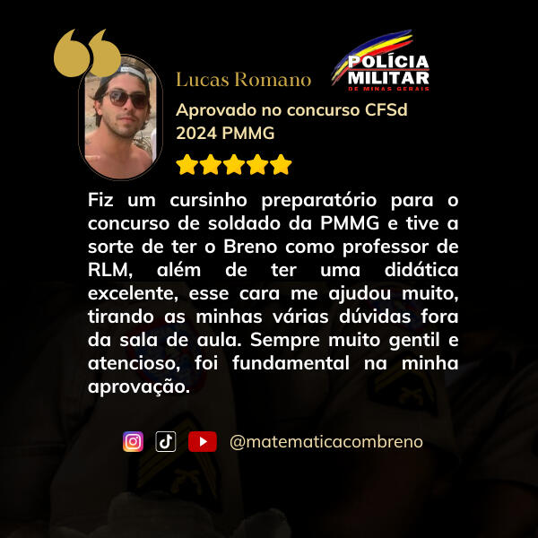 Me chamo Breno, professor de matemática formado pela UFMG e mestre pela UFOP, atuo como educador há 15 anos. A família é minha maior motivação e meu objetivo é simplificar o ensino da matemática, pois acredito que todos podem aprender com a abordagem certa. Já ajudei centenas de concurseiros a dominarem a disciplina mais temida e garantirem a aprovação. Agora é a sua vez!"